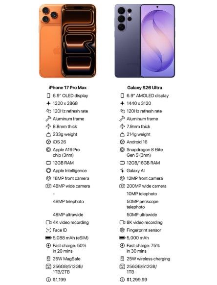 Specs at a Glance: S26 Ultra vs. iPhone 17 Pro Max